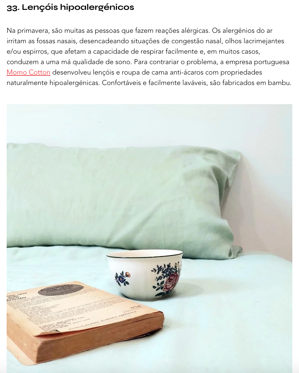 L’entreprise portugaise Momo Cotton a développé des draps et du linge de lit anti-acariens aux propriétés naturellement hypoallergéniques. Confortables et faciles à laver, ils sont fabriqués en bambou.